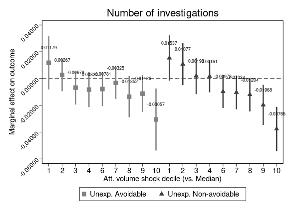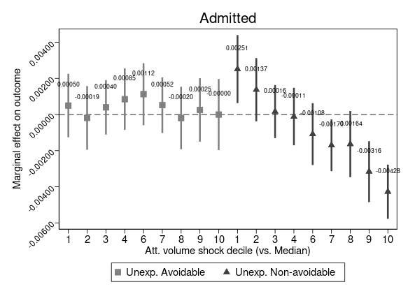 We find evidence confirming these hypotheses. Unexpected demand from avoidable patients causes little to no disruption to the care received by urgent patients, and sensibly less than disruption caused by unexpected demand from non-avoidable patients. The following figure shows a good example, where unexpected avoidable attendances aren’t changing the probability of being admitted of urgent patients. Not necessarily surpising I guess, but important to also verify empirically.